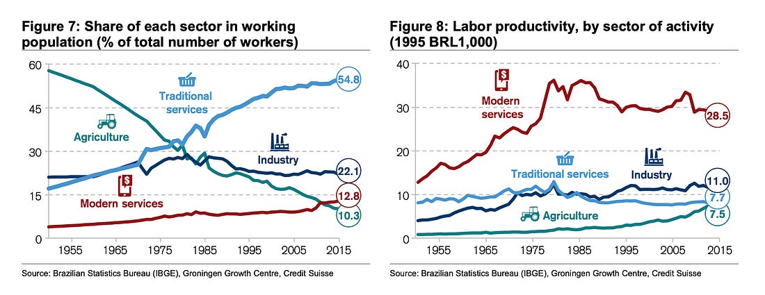 A desindustrialização precoce em números: a indústria no Brasil perde espaço e os serviços tradicionais crescem — com produtividade muito menor. O culpado não é a falta de políticas industriais. O Brasil implementou políticas tecnológicas e de inovação com competência nas últimas décadas. O problema é que essas políticas travaram uma guerra silenciosa contra a macroeconomia. E a macroeconomia venceu. De forma brutal e definitiva. Hoje vou mostrar como três erros macroeconômicos sistemáticos assassinaram a indústria brasileira enquanto os países asiáticos fizeram exatamente o oposto e viraram potências. Vamos mergulhar! O primeiro assassino: juros estratosféricos que tornaram a produção um péssimo negócio.Imagine tentar empreender num país onde você pode dobrar seu dinheiro a cada dois anos sem fazer absolutamente nada. Apenas aplicando em títulos públicos. Foi exatamente isso que aconteceu no Brasil. Durante a era FHC, os juros chegaram a 40% ao ano. Na era Lula, mesmo com todas as tentativas de política industrial, o Banco Central aplicou choques que levaram a taxa a 24%. Esses números não são apenas altos - são economicamente assassinos. Nenhum investimento produtivo consegue competir com essa rentabilidade sem risco. Por que construir uma fábrica? Por que investir em pesquisa e desenvolvimento? Por que inovar? A classe rentista brasileira descobriu o segredo: ficou rica na moleza, quintuplicando fortunas em 15 anos enquanto o país se desindustrializava. Os juros altos também explodiram a dívida pública. A dívida interna saltou de 108 bilhões em 1994 para 328 bilhões em 1998. A dívida externa foi de 148 bilhões para 241 bilhões no mesmo período. Quando o governo gasta uma fatia gigantesca do orçamento pagando juros, sobra menos para infraestrutura, educação e tecnologia. O fiscal vira refém do rentismo. Enquanto isso, os asiáticos mantiveram juros baixos por décadas. Não por acaso - mas por estratégia deliberada de forçar o capital a buscar oportunidades produtivas. Se você não pode ganhar dinheiro fácil com juros, precisa investir em fábricas, inovação e exportação. Simples assim. O segundo assassino: câmbio sobreapreciado que transformou industriais em importadores.A taxa de câmbio determina o que uma economia vai produzir. É o preço relativo entre bens transacionáveis (que competem no mercado global) e não transacionáveis (imóveis, serviços locais). Quando o câmbio está apreciado, a economia recebe um sinal brutal: pare de produzir manufaturas complexas e foque em commodities e serviços. As apreciações cambiais das eras FHC, Lula e Dilma destruíram a indústria brasileira por três caminhos simultâneos. Primeiro, aniquilaram as margens de lucro. O setor de bens transacionáveis sofre duplamente com câmbio apreciado: os preços dos produtos caem dentro do país e os custos de produção sobem (salários são não transacionáveis). A rentabilidade desaparece. Sem incentivo para produzir domesticamente e sem condições de competir no mercado mundial, o empresário industrial brasileiro virou importador, montador ou simplesmente fechou as portas. Segundo, redirecionaram investimentos para setores improdutivos. Os recursos migraram para imóveis, shopping centers, construção civil e serviços de baixa sofisticação. A alavancagem de crédito na era Lula e Dilma provocou um boom imobiliário e de consumo. Toda a expansão do PIB pós-2008 foi baseada em serviços não sofisticados. A indústria entrou em colapso enquanto construíamos prédios e shoppings. Terceiro, reprimarizaram violentamente a pauta exportadora. Em 2014, cinco produtos respondiam por quase 50% das exportações: ferro, soja, açúcar, petróleo e carnes. O Brasil regrediu tecnologicamente de forma assustadora. Enquanto isso, Coreia do Sul, China, Tailândia e Malásia mantiveram câmbio competitivo e exportam eletrônicos, máquinas, automóveis e produtos de alta complexidade. A abertura comercial dos anos 1990, combinada com câmbio sobrevalorizado, foi equivalente a uma bomba nuclear na estrutura produtiva brasileira. O terceiro assassino: a guerra entre política industrial e macroeconomia que ninguém coordenou.Aqui está o cerne do problema que mata o desenvolvimento brasileiro: você não pode fazer política industrial com os preços macroeconômicos errados. É impossível. É como tentar enxugar gelo. O governo Lula é o exemplo perfeito dessa contradição assassina. De um lado, lançou políticas industriais sofisticadas: PAC, Política de Desenvolvimento Produtivo, Lei do Bem, Lei de Inovação, PITCE, PDP. Tudo bem desenhado, com recursos, com governança. Do outro lado, o Ministério da Fazenda com Palocci e o Banco Central com Meirelles aplicaram uma política macroeconômica duríssima: choque de juros a 24% e câmbio ultravalorizado. O governo ficou completamente desarticulado. Uma mão construindo, a outra demolindo. Bresser-Pereira sempre alertou: nessas condições você fica “enxugando gelo”. As políticas industriais criam estímulos, mas esses estímulos são totalmente neutralizados pelo desestímulo violento de juros altos e câmbio apreciado. A comunidade de ciência e tecnologia realiza no Brasil um trabalho admirável, mas os resultados são anulados pela macroeconomia desastrosa. Não adianta ter política industrial competente quando a macro está assassinando a indústria. Os asiáticos sempre mantiveram os cinco preços macroeconômicos no lugar certo: → Taxa de juros baixa → Taxa de câmbio competitiva → Salários crescendo com produtividade → Inflação baixa → Lucros empresariais altos.